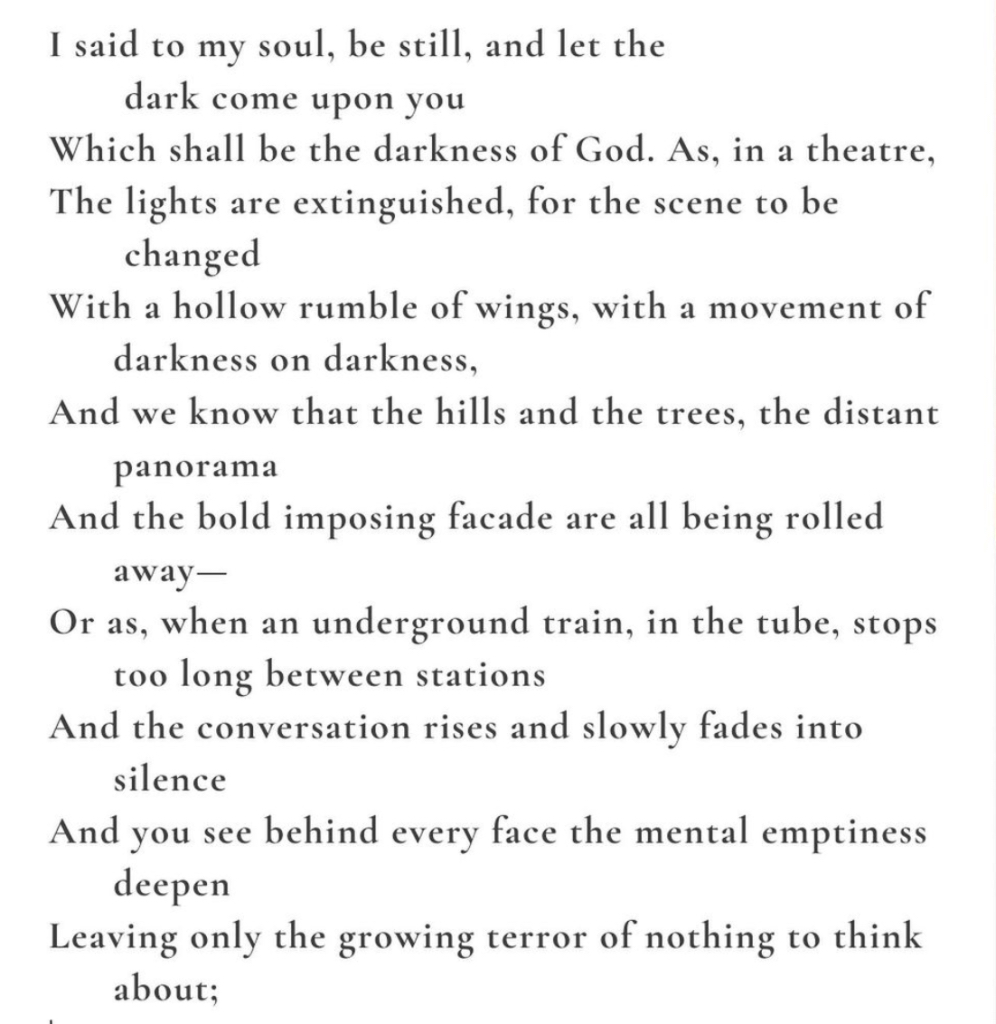 For most of these we’re taking our cue from a favourite Instagram site of mine – #realpoetsdaily Today, we’re blessed by this gem by T. S. Eliot, excerpted from “The Four Quartets.”
